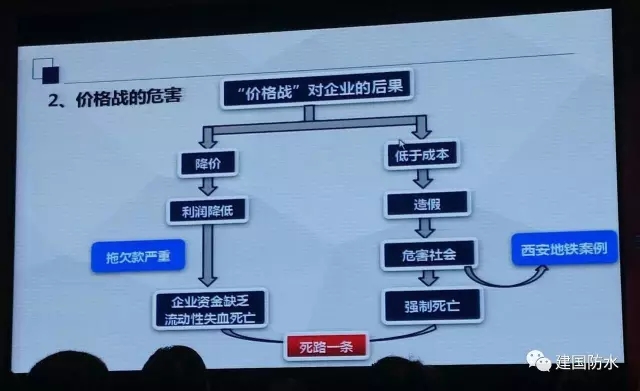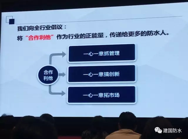 楊理事長(zhǎng)主要就三個(gè)大家較為關(guān)注的行業(yè)問(wèn)題進(jìn)行分析講解,他著重強(qiáng)調(diào),企業(yè)之間打價(jià)格戰(zhàn)最終只能走向“滅亡”,號(hào)召企業(yè)要進(jìn)行創(chuàng)新,依靠新產(chǎn)品、新技術(shù)、新管理、新組織、控制原材料等取得利潤(rùn),才能使企業(yè)在嚴(yán)峻的市場(chǎng)環(huán)境下穩(wěn)步前行。并且向全行業(yè)倡議,將“合作利他”作為行業(yè)的正能量,傳遞給更多的防水人。